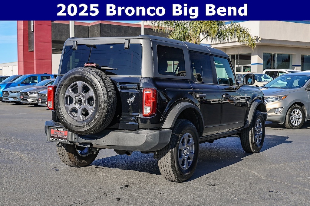 All of our Pre-Owned vehicles are subject to a 100 point inspection to ensure safety and reliability. 2-Door Intelligent Access w/Lock/Unlock, 4-Wheel Disc Brakes, 4.46 Axle Ratio, 7 Speakers, ABS brakes, Air Conditioning, Alloy wheels, AM/FM radio: SiriusXM with 360L, AM/FM Stereo, Ambient Footwell Lighting, Auto High-Beam Headlamps, Auto High-beam Headlights, BLIS Blind Spot Information System, Brake assist, Carbonized Gray Molded-In-Color Hard Top, Cloth Bucket Seats, Compass, Connected Navigation, Delay-off headlights, Dr & Pass Illuminated Sliding Visor Vanity Mirrors, Driver door bin, Driver vanity mirror, Dual front impact airbags, Dual front side impact airbags, Dual Smart Charging USB Ports, Dual-Zone Electronic Automatic Temperature Control, Electronic Stability Control, Emergency communication system: 911 Assist, Equipment Group 222A Mid Package, Exterior Parking Camera Rear, Front anti-roll bar, Front Bucket Seats, Front Center Armrest, Front License Plate Bracket, Front reading lights, Front Row Heated Seats, Front wheel independent suspension, Fully automatic headlights, Heated door mirrors, Illuminated entry, Integrated roll-over protection, Lane-Keeping System, Leather Shift Knob, Low tire pressure warning, Occupant sensing airbag, Outside temperature display, Overhead airbag, Overhead console, Panic alarm, Passenger door bin, Passenger vanity mirror, Power door mirrors, Power Outlet - Back Side of Center Floor Console, Power steering, Power windows, Pre-Collision Assist w/Automatic Emergency Braking, Radio data system, Rear Parking Sensors, Rear-View Camera, Rear-Window Defroster & Washer, Remote keyless entry, Security system, SiriusXM w/360L, Speed control, Split folding rear seat, Steering wheel mounted audio controls, SYNC 4, Tachometer, Telescoping steering wheel, Tilt steering wheel, Traction control, Trip computer, Variably intermittent wipers, Wheels: 17 Carbonized Gray-Painted Aluminum. Shadow Black 2025 Ford Bronco Big Bend 4WD 10-Speed Automatic 2.3L EcoBoost I-4 When was the last time you used the word 'love' to describe how you feel about your car? At Santa Maria Ford, we hear our customers say it all the time, and for good reason. Serving drivers from Paso Robles, Santa Barbara, and Pismo Beach, we offer a wide range of new and used offerings from Ford.